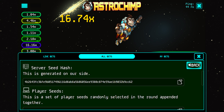 Stay fully informed with a detailed Stats Panel that logs your gameplay, and experience real-time excitement as you watch when other players cash out. With Fair Play Assurance, Astrochimp promises a secure, transparent gaming experience—so you can immerse yourself in the adventure without worries.