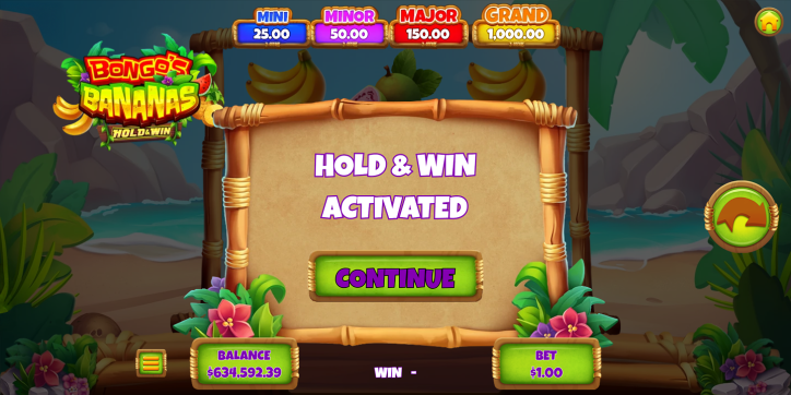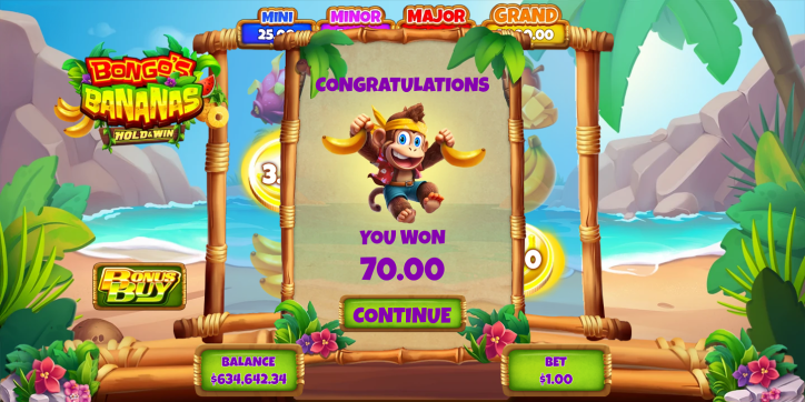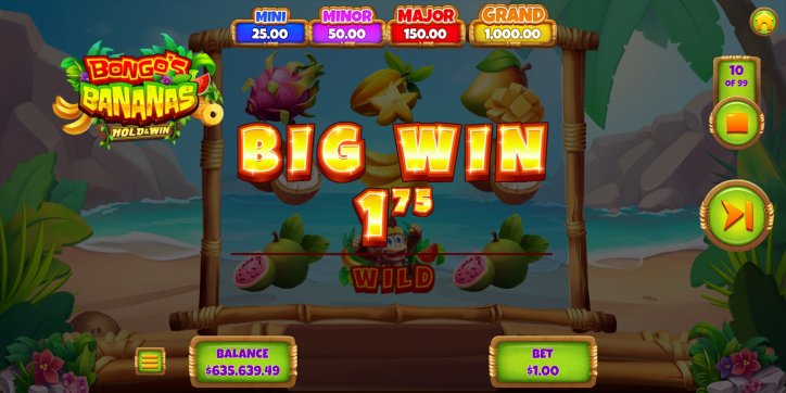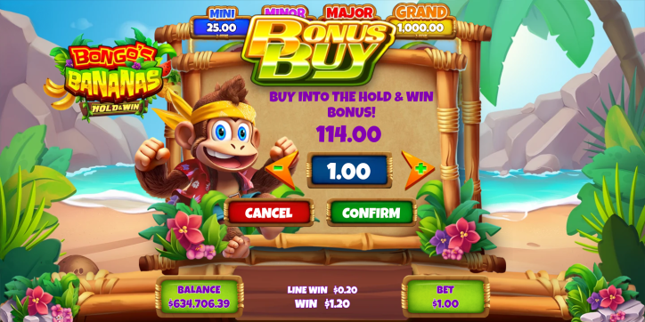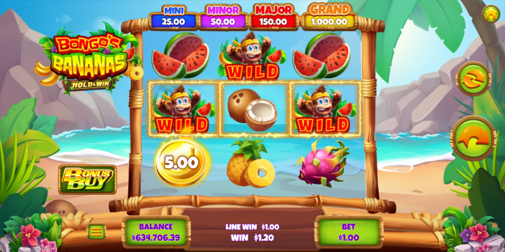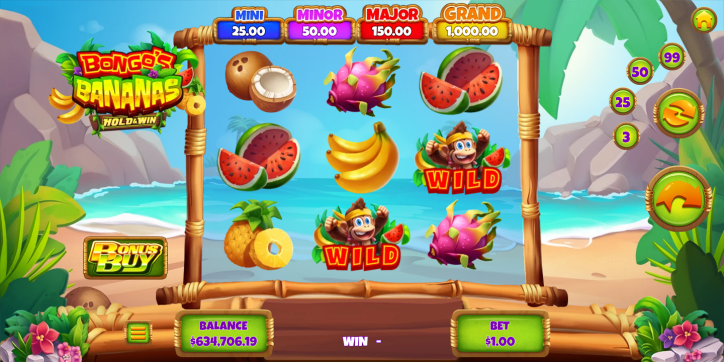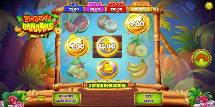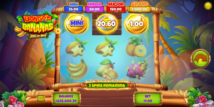 Bongo’s Bananas – Hold & Win is a vibrant 3-reel slot that blends lighthearted jungle charm with proven Hold & Win mechanics players love. Guided by Bongo, a charismatic monkey host, players collect shimmering Banana Prize Coins and activate the Hold & Win Bonus for re-spins that stack rewards in real time. With four enticing in-game jackpots, bold visuals, and a fast, satisfying gameplay loop inspired by top-performing Hold & Win titles, Bongo’s Bananas offers an inviting, high-retention experience designed to appeal to both casual players and jackpot chasers alike.