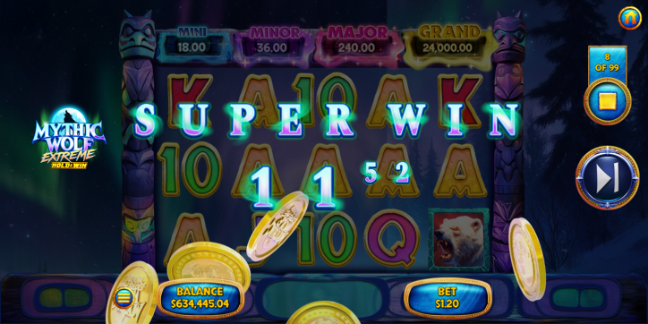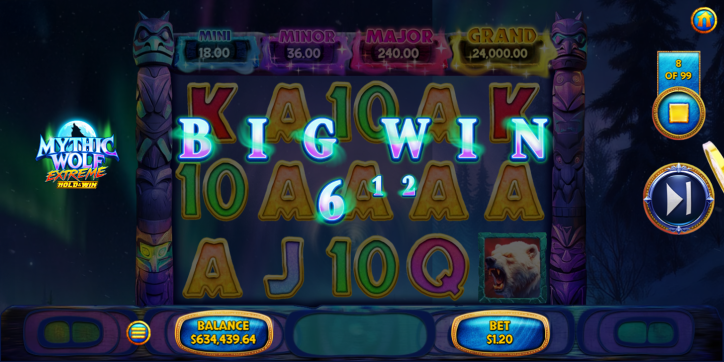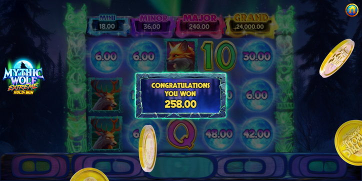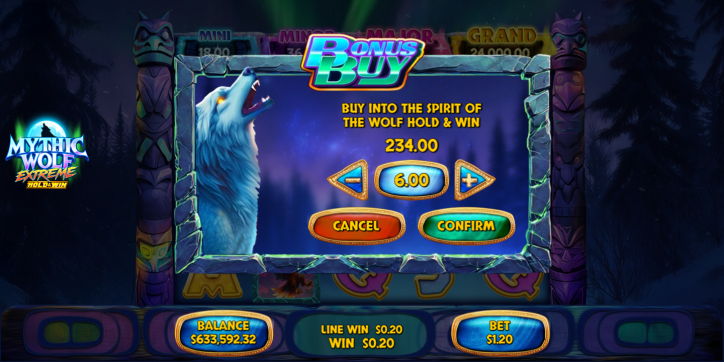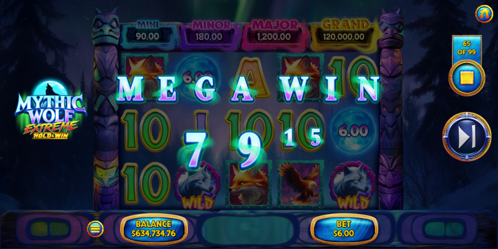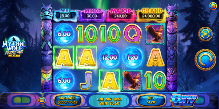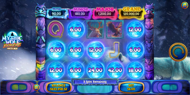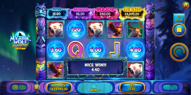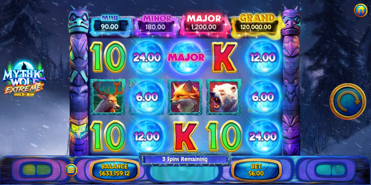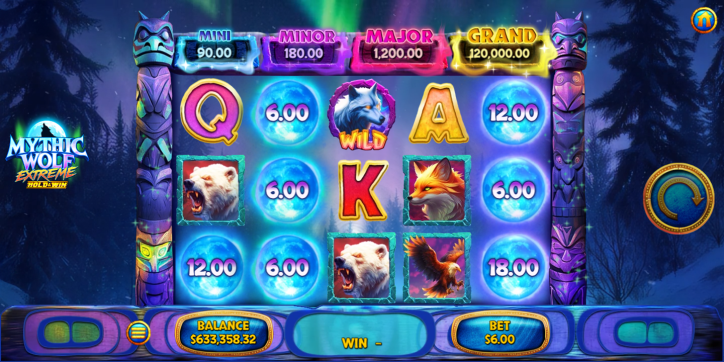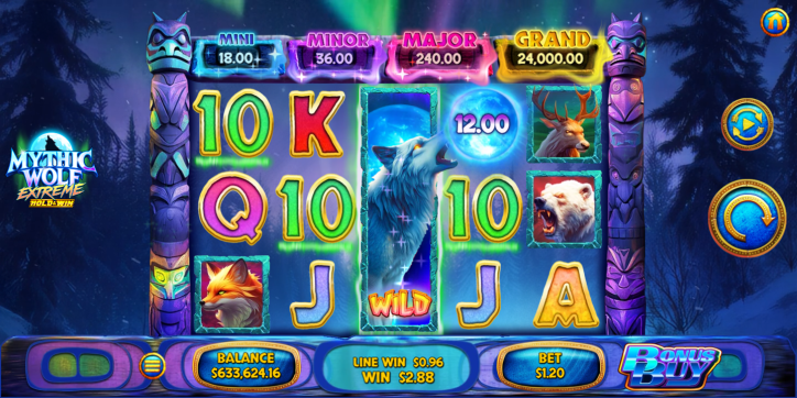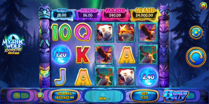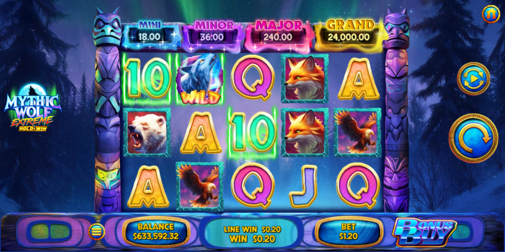 Answer the call of the wild in Mythic Wolf Extreme – Hold & Win! When the Wolf Wild lands on reel 3, it expands to cover the reel and triggers a powerful Re-spin. Awaken the Spirit of the Wolf to enter the Hold & Win feature, where jackpots await under the moonlight. With Bonus Buy at your command, the hunt for epic rewards is always within reach.