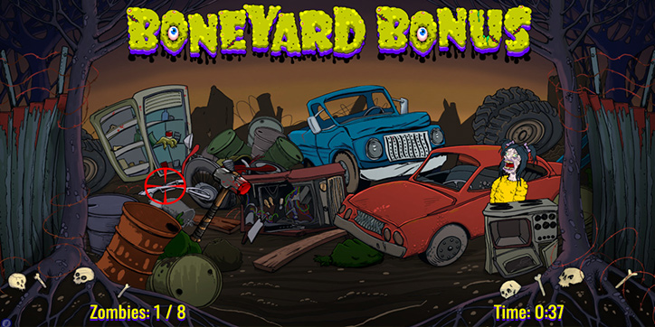 Two horrifying bonus rounds await you on your quest for survival. 3 or more brain icons trigger the Boneyard Bonus. Playing Whack-A-Zombie is a great way to pass the time, so you must choose a weapon to smash any hiding zombie that dares to show their ugly face.